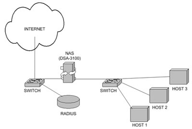 Теперь более подробно о том, как будет выглядеть наша учётно-биллинговая система и как она будет работать. Схема сети при этом стандартная для архитектуры с RADIUS: LAN ---> NAS--->RADIUS--->WAN: (NAS в нашем случае работает как прокси-сервер (в DSA-3100 включён NAT)).