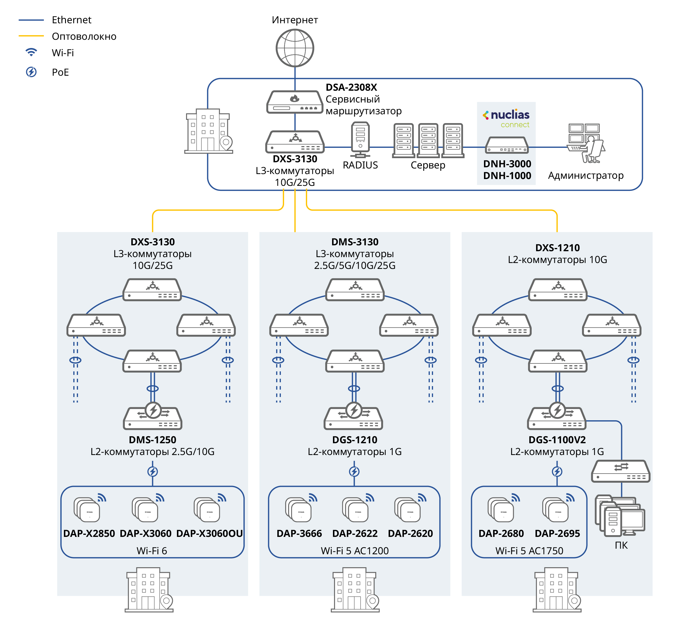- внутренние и внешние точки доступа серии DAP c поддержкой стандартов Wi-Fi 6/5,