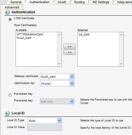 7. IPSec VPN tuneliams (konfigūravimo aprašas yra pateiktas kitame pavyzdyje) nurodykite naudojamus sertifikatus ir raktus. Pasirinkite Interfaces -> IPSec, tada pasirinkite Authentification ir Prie-shared Key pakesikite į X.509 Certificate. Parinkite naudojamą Root Certificate: ca_cert ir Gateway certificate: local_cert.