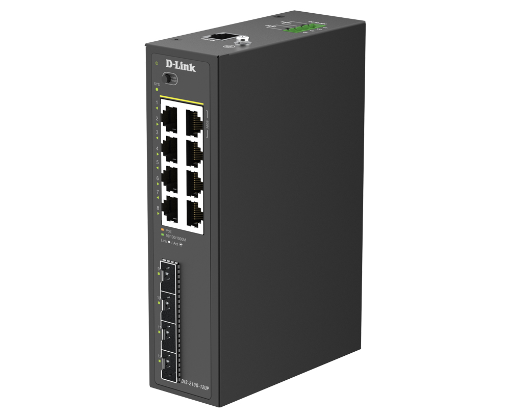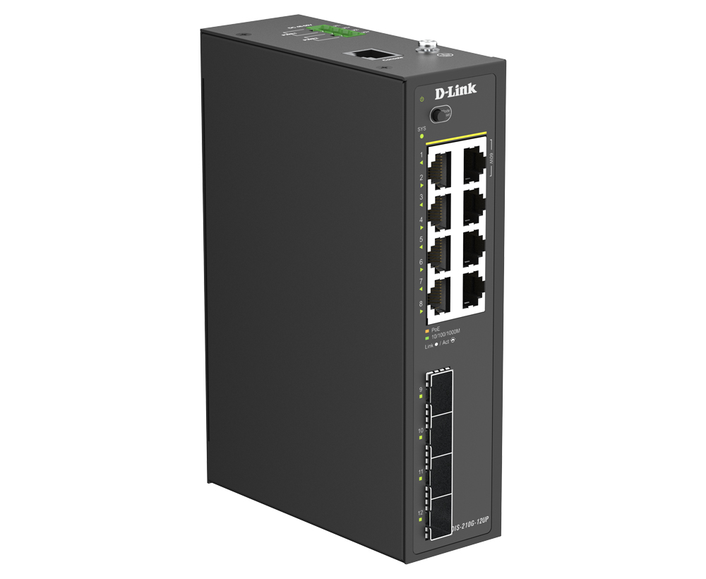 The DIS-210G-12UP Layer 2 Gigabit Industrial Managed Switch is equipped with 6 30 W PoE-capable 10/100/1000Base-T ports, 2 60 W PoE-capable 10/100/1000BASE-T ports and 4 SFP ports. This switch features a robust design making it ideal for deployment in industrial and outdoor cabinet surveillance settings, capable of withstanding the harshest environments. The DIS-210G-12UP switch furthermore integrates advanced management and security functions to provide a complete industrial networking solution.
