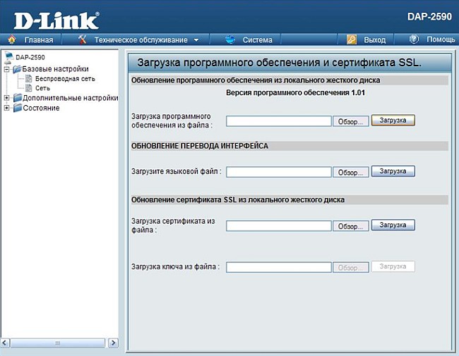 Зайдите в меню Техническое обслуживание и выберите пункт Загрузка программного обеспечения и сертификата SSL . В блоке Обновление программного обеспечения из локального жесткого диска нажмите кнопку Обзор… и укажите местоположение сохраненной новой версии программного обеспечения на жестком диске. После этого нажмите кнопку Загрузка и устройство обновит ПО.