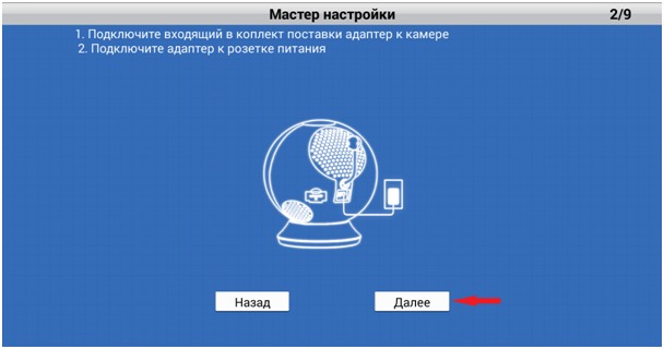 Шаг 6: Если Вы еще не сделали этого, подключите к камере входящий в комплект поставки кабель питания (или USB-аккумулятор). Коснитесь значка Далее