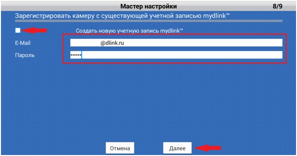 2. Если у Вас нет учетной записи mydlink, установите флажок в поле Создать новую учетную запись mydlink™ и введите адрес электронной почты и пароль для новой учетной записи. Коснитесь Далее