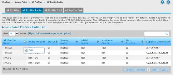 - Перейти в меню Wireless → Access Point → AP Profiles → AP Profile Radio