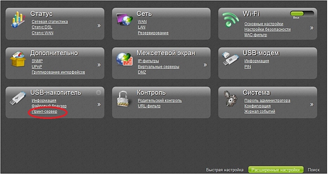 На странице  USB накопитель / Принт-сервер  Вы можете  настроить  маршрутизатор  в качестве   принт-сервера.   Такая   настройка   позволит   пользователям   Вашей   локальной   сети совместно использовать принтер, подключенный к USB-порту маршрутизатора.