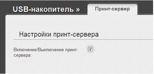 1. Зайдите на веб-интерфейс маршрутизатора в раздел расширенных настроек USB-накопитель/Принт-сервер и установите флажок для включения принт-сервера.
