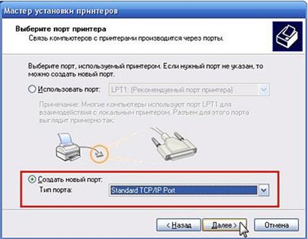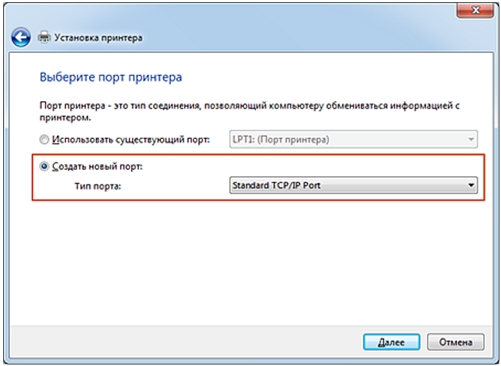 3. Укажите порт, используемый принтером. Выберите параметр Создать новый порт и в поле Тип порта установите Standard TCP/IP Port (Стандартный порт TCP/IP).