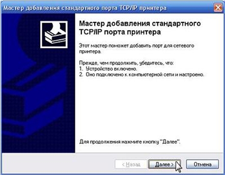 Появится окно мастера добавления стандартного порта TCP/IP принтера. Для продолжения работы мастера нажмите Далее.