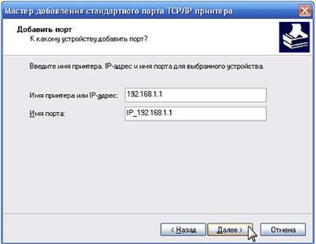 4. В следующем окне в поле Имя принтера или IP-адрес укажите локальный IP-адрес маршрутизатора (по умолчанию 192.168.1.1) и нажмите Далее.