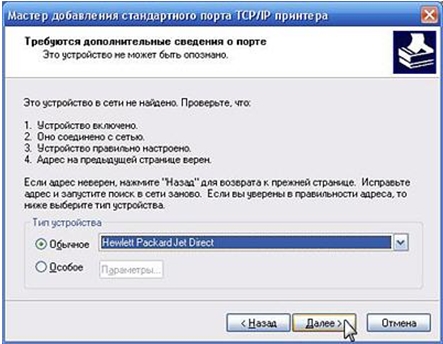 В следующем окне нужно указать тип устройства. В нашем примере используется принтер HP LaserJet 2200, поэтому мы указали параметр Hewlett Packard Jet Direct.