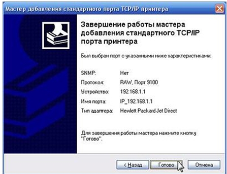 Для завершения работы мастера добавления нового порта принтера нажмите кнопку Готово.