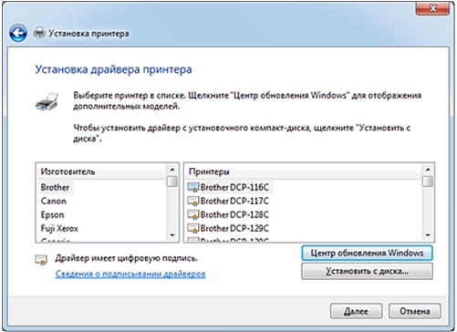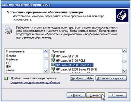 5. Далее появится окно мастера установки принтеров. Выберите из предлагаемого списка нужного изготовителя и модель вашего принтера. Для продолжения установки драйвера принтера нажмите кнопку Далее.