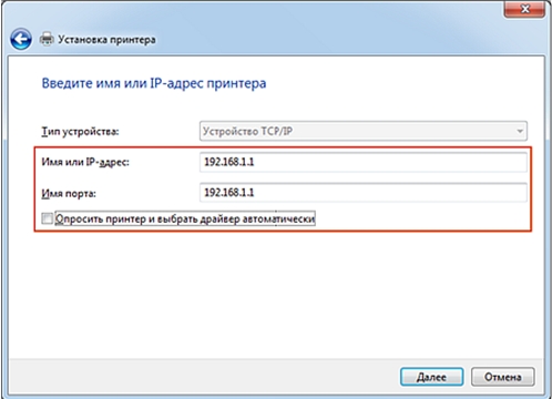 Далее в поле Имя или IP-адрес введите IP-адрес маршрутизатора (по умолчанию 192.168.1.1) и снимите галочку Автоматического обнаружения драйвера принтера.