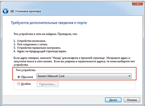 Если для вашего принтера нет соответствующего типа, то можно указать Generic Network Card (общий сетевой, см. Вариант 2) или поставить тип Особое (например, для принтеров Samsung ML-1660/ML-1665/SCX-3205 следует указывать тип Особое, а параметры оставить по умолчанию).