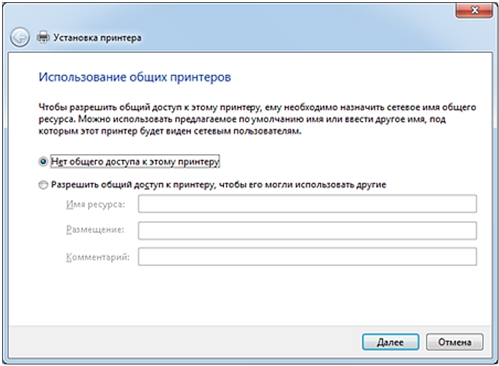 Не делайте принтер общим для совместного использования с другими пользователями сети. Оставьте по умолчанию значение Нет общего доступа к этому принтеру