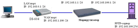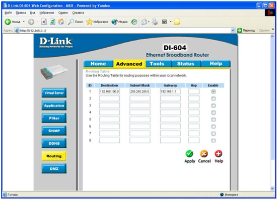 Проблема заключается в том, что при подобной организации сети некоторых провайдеров на интернет-шлюзах серии DI-XXX, в частности, DI-604, не получается организовать тоннель PPTP между DI-604 и PPTP-сервером провайдера. Причина в том, что в настройках соединения PPTP на интерент-шлюзах DI-XXX нет возможности ввести IP-адрес шлюза по умолчанию для обеспечения прохождения пакетов от DI-604 к серверу провайдера для установки PPTP-соединения. Задача решается следующим образом: в настройках DI-604 (а также любого интернет-шлюза данной серии) на закладке Advanced в пукте Routing прописывается маршрут к PPTP-серверу провайдера через маршрутизатор. В данном случае пакеты достигают назначения, т.е. PPTP-сервер и соединение PPTP устанавливается. Вот как выглядят настройки: