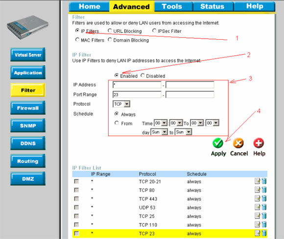 2. При оставлении пустыми полей "Port Range" - блокируются все порты для указанных компьютеров.