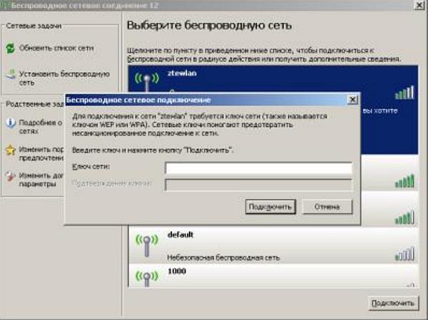 4. При попытке подключения адаптера к беспроводной сети с шифрованием появится диалоговое окно, в котором необходимо будет ввести ключ сети.