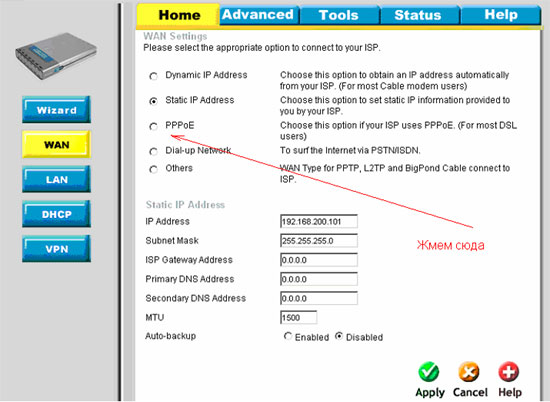 В Web-интерфейсе управления устройством нужно перейти на закладку Home -> Wan. (далее шаги настройки и screenshots приводятся на примере DI-804HV F/W v1.40, для других устройств все настраивается аналогичным образом).