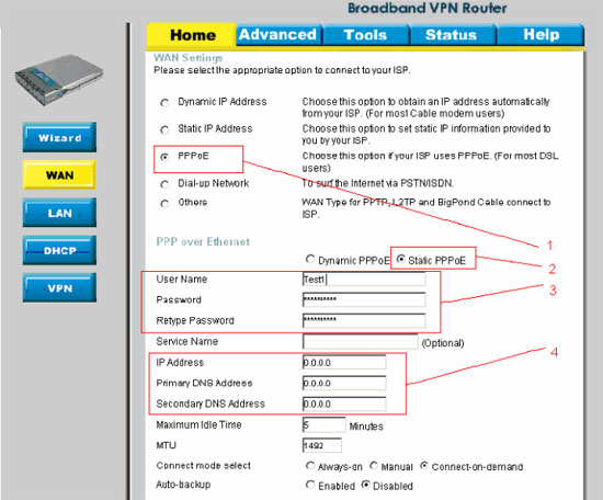 b) Connect mode select - режим установки соединения. На рисунке выбрано "Connect-on-Demand" - установка соединения при необходимости - то есть при появлении активности устройство установит соединение, а при отсутствии активности более времени, указанного в "Maximum Idle Time" - отсоединиться. Также можно поставить режим "Always-on" для постоянного подключения.