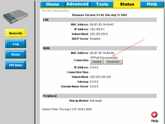 a) Видим сообщение "PPPoE disconnected" (показано стрелкой) - нажимаем кнопку "Connect".