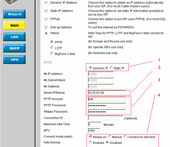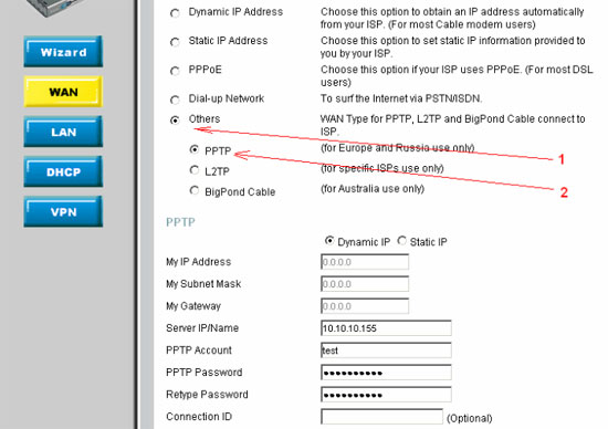 I) Выбираем тип подключения "Others" , затем "PPTP".