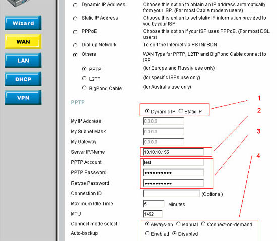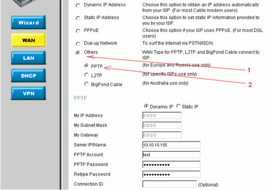 Выбираем тип подключения Others, затем PPTP. Появляется страничка настройки параметров подключения (См. рис. 1)