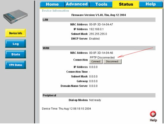 После этого переходим на страничку Status - > Device Info. a) В случае, если при настройке соединения на шаге 4а было выбрано "Always-on", то должно быть сообщение "PPTP connected".