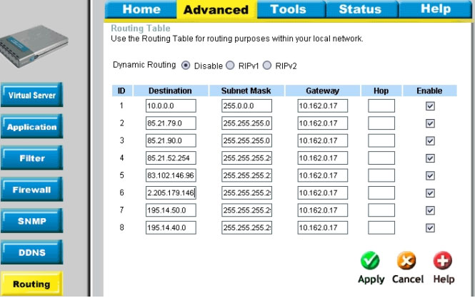 Для того, чтобы пользоваться локальными ресурсами, вам необходимо настроить статическую маршрутизацию на вашем устройстве. Для этого выберите выкладку Advanced и поле Routring. Выставите Dynamic Routing в Disable и впишите в таблицу маршруты, которые можно посмотреть на (Рис. 4)
