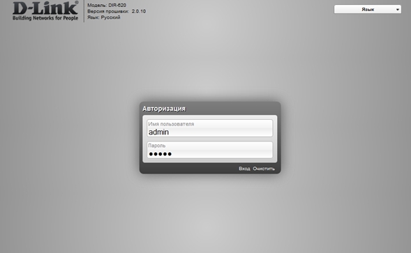 2. Обратитесь к Web-интерфейсу маршрутизатора по адресу 192.168.0.1 и авторизуйтесь (по умолчанию имя пользователя – admin, пароль – admin).