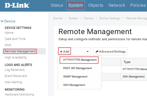 Пройдите в веб интерфейсе System → Remote management, нажмите кнопку Add и выберите HTTP/HTTPS management.