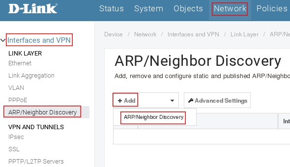 Пройдите в web интерфейсе Network → Interfaces and VPN → ARP/Neighbor Discovery, нажмите кнопку Add из из выпадающего меню выберите ARP/Neighbor Discovery