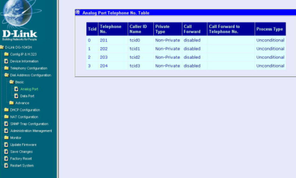 В данном примере порт 1 DG104SH с Tcid0 имеет номер телефона 201, порт 2 с Tcid1 имеет номер телефона 202 и так далее в зависимости от Ваших настроек.