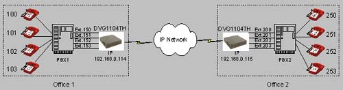 Диаграмма тестовой сети: два офиса (Office 1 и Office 2) находятся в разных городах и соединены между собой IP сетью. Абоненту с номером "100", находящемуся в Office1, необходимо позвонить абоненту с номером "251", находящемуся в Office 2. Абонент с номером "100", набирает на своем телефоне "150" (Ext. АТС, подключенный к 1-му порту DVG1104TH IP 192.168.0.114) и автоматически попадает на порт с номером "200" (Ext. АТС, подключенный к 1-му порту DVG1104TH IP 192.168.0.115), далее набирает номер внутреннего абонента "251".