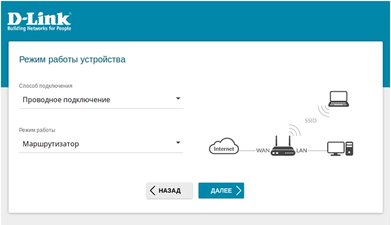 - В списке Способ подключения выберите Проводное подключение, в качестве режима работы задайте Маршрутизатор и нажмите Далее.