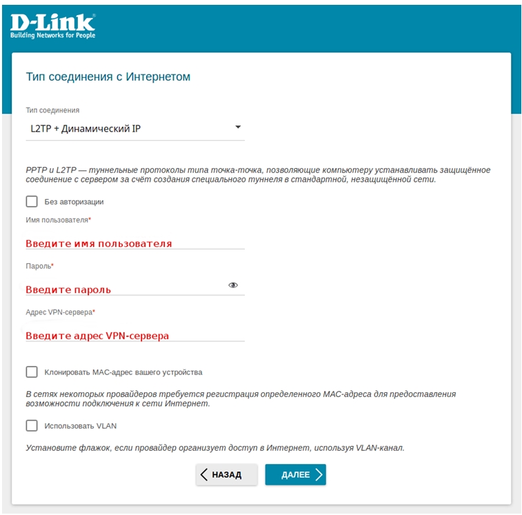 Если ваш интернет-провайдер организует доступ в сеть Интернет, используя технологию VLAN, установите флажок в поле Использовать VLAN и пропишите VLAN ID.