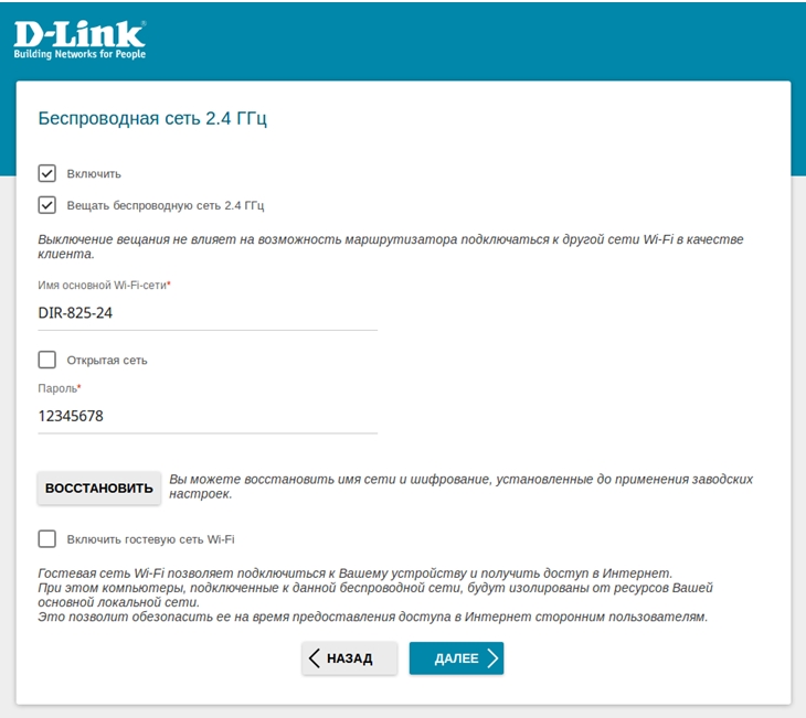 7. Аналогично выполняется настройка беспроводной сети для диапазона 5 ГГц. Для перехода к следующему шагу настройки нажмите Далее.