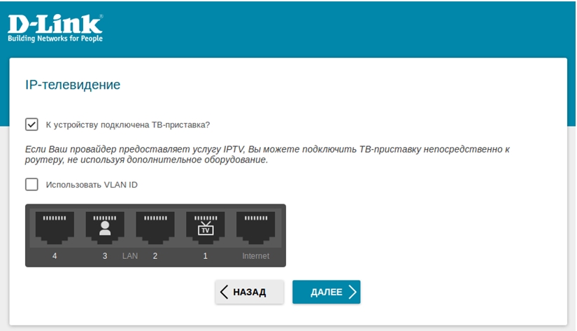 8. Если к маршрутизатору подключена ТВ-приставка, установите флажок в соответствующее поле и выберите порт маршрутизатора, к которому она подключена (на примере выбран порт № 1).