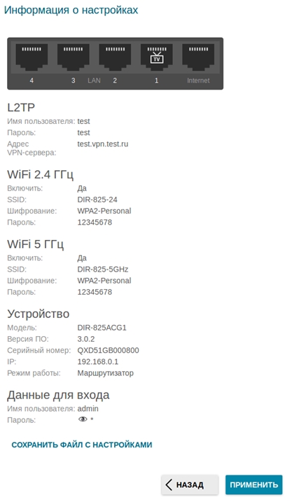 11. На следующей странице должно появиться окно с информацией о выполненных настройках. Вы можете сохранить данные настройки в текстовый документ, нажав для этого кнопку Сохранить файл с настройками.