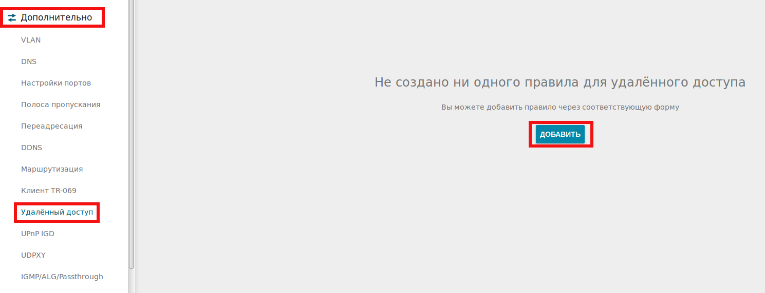 2. В основном меню слева в разделе Дополнительно выберите Удаленный доступ и на открывшейся странице нажмите Добавить.