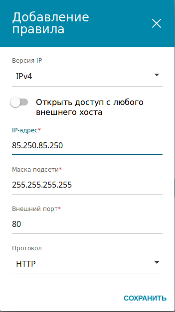 3. Введите IP-адрес удаленного хоста, для которого вы разрешаете доступ, укажите Маску подсети (стандартно 255.255.255.255), укажите внешний порт, который будет использоваться для доступа (по умолчанию – 80 порт). Нажмите Применить для добавления правила в список.