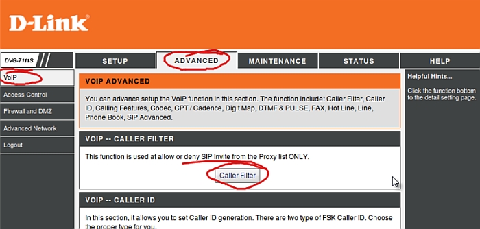 1. В веб-интерфейсе шлюза открываем Advanced → VoIP → Caller Filter