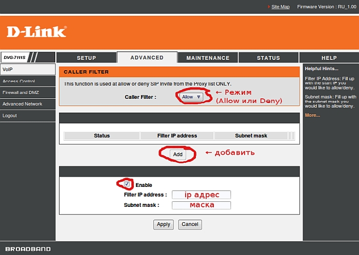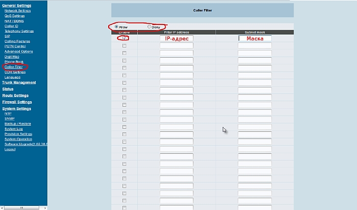 2. В меню Caller Filter выбираем режим работы - Allow (запретить доступ всем IP-адреса, кроме указанных) или Deny (заблокировать указанные IP-адреса)