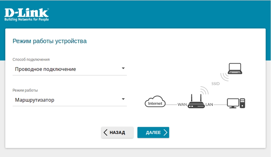 4. В списке Способ подключения выберите Проводное подключение, в качестве режима работы задайте Маршрутизатор и нажмите Далее.