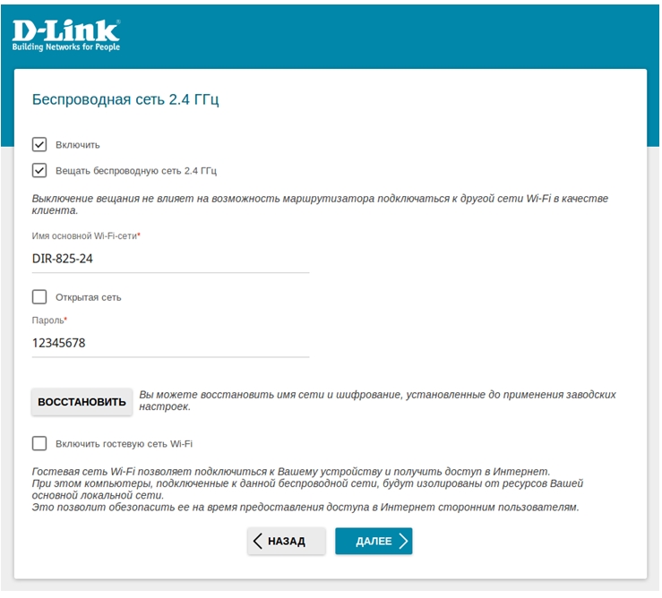 7. Аналогично выполняется настройка беспроводной сети для диапазона 5 ГГц. Для перехода к следующему шагу настройки нажмите Далее.