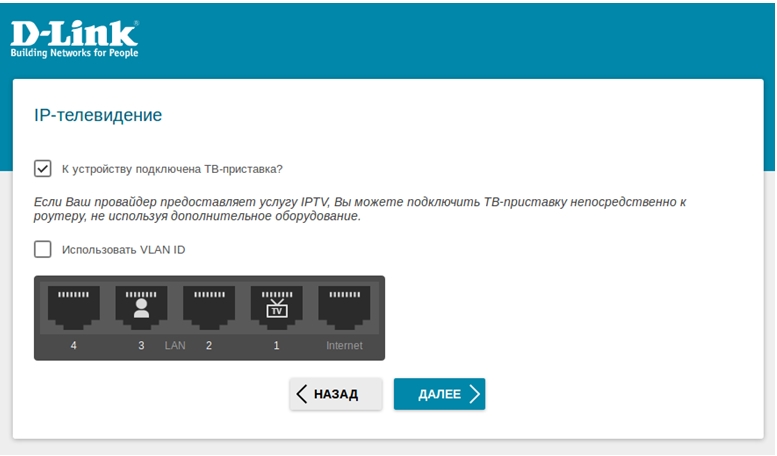 8. Если к маршрутизатору подключена ТВ-приставка, установите флажок в соответствующее поле и выберите порт маршрутизатора, к которому она подключена (на примере выбран порт № 1).