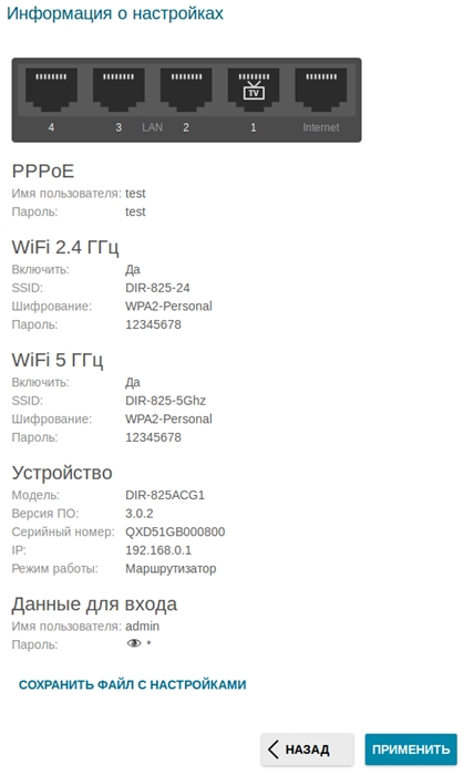 11. На следующей странице должно появиться окно с информацией о выполненных настройках. Вы можете сохранить данные настройки в текстовый документ, нажав для этого кнопку Сохранить файл с настройками.