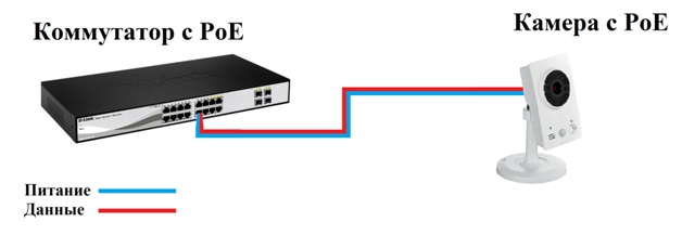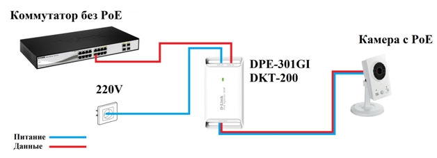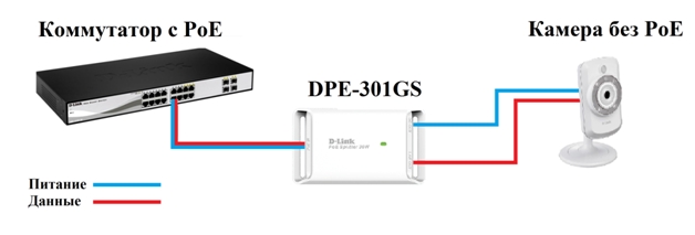 3) Подключение камеры без поддержки PoE к коммутатору с поддержкой PoE