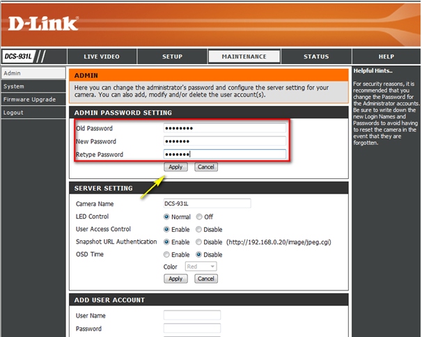 Вопрос: Как задать пароль администратора на камере DCS-9хх?