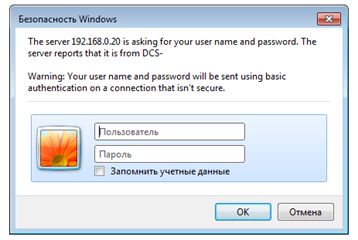 Шаг 1. Откройте Web-браузер Internet Explorer и введите в адресной строке IP-адрес камеры (по умолчанию 192.168.0.20). Нажмите Enter. По умолчанию именем пользователя является admin, поле пароля оставьте незаполненным. Нажмите OK.